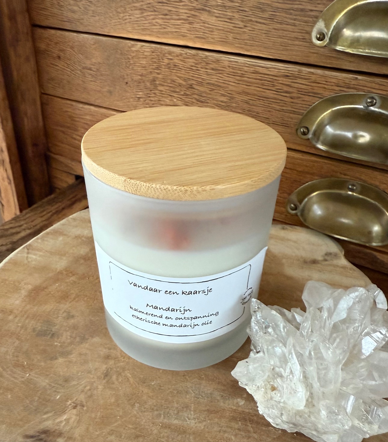 Deze heerlijke handgemaakte kaars is gemaakt van sojawas, met 100% etherische mandarijn olie en calendula bloemen. .Werkt kalmerend en ontspant.