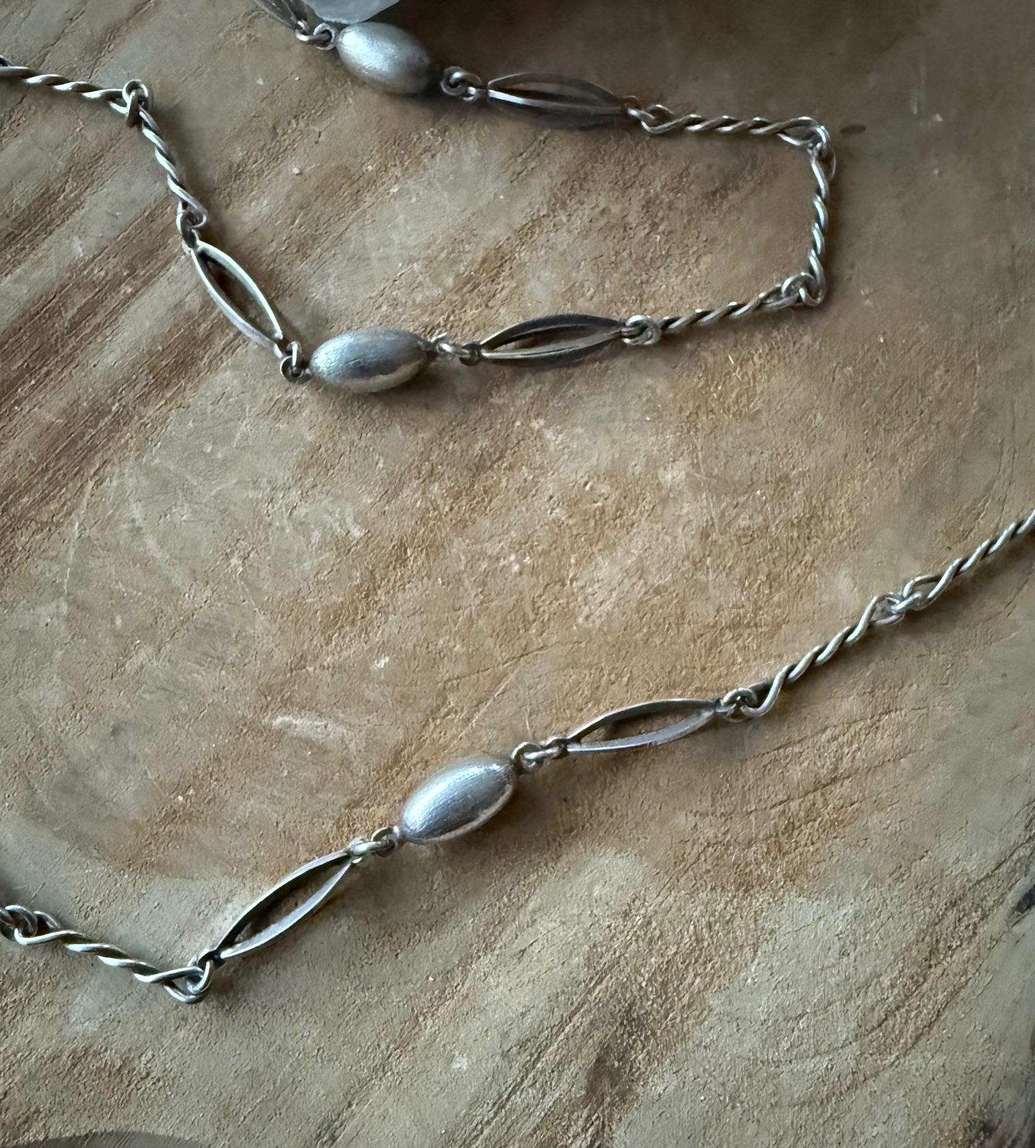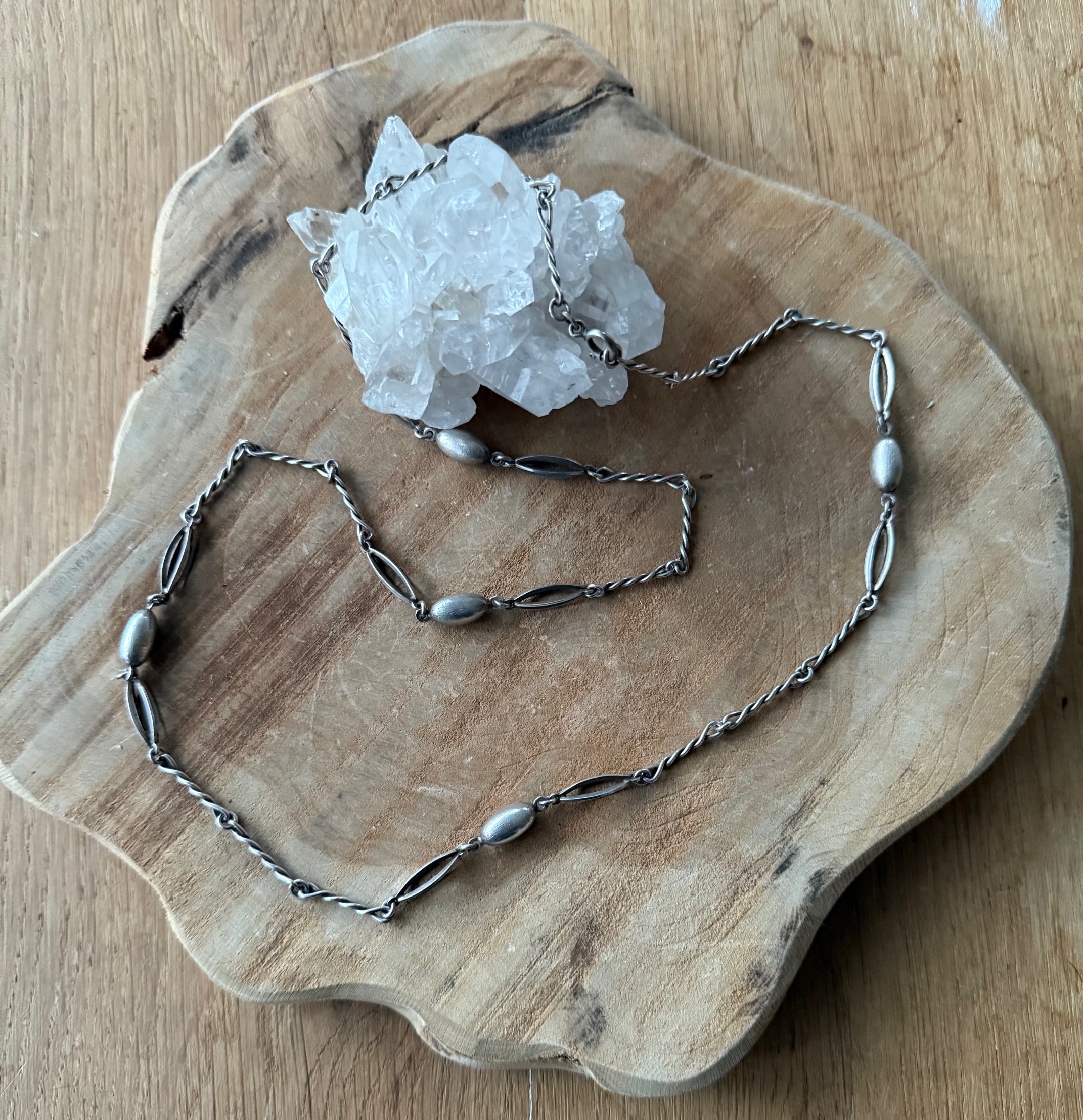 Deze mooie zilveren ketting, 925 gehalte is 70 cm lang. De grootste kraal is 1.4 x 0.7 cm en de kettinkjes tussendoor zijn 2 x 0.2 cm.